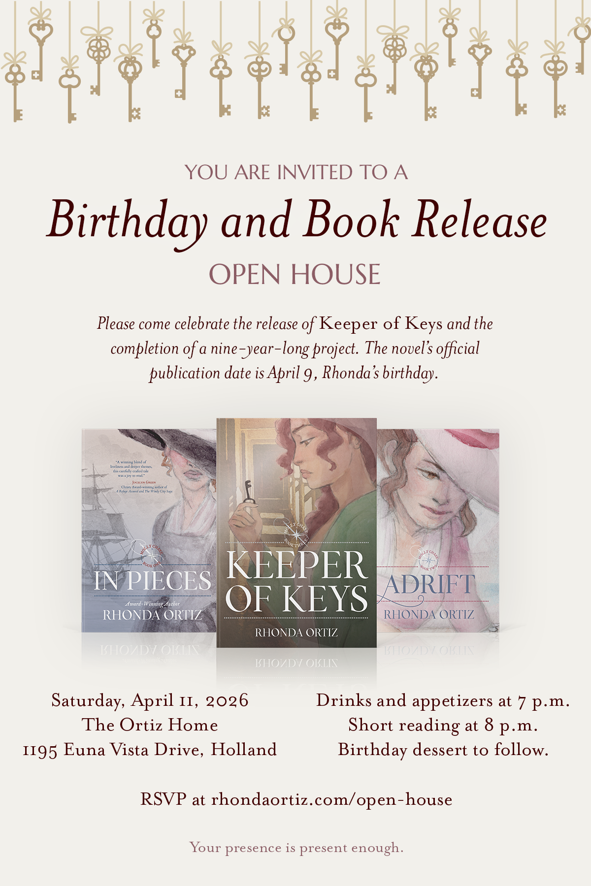 Please come celebrate the release of Keeper of Keys and the completion of a nine-year-long project. The novel’s official publication date is April 9, Rhonda’s birthday.